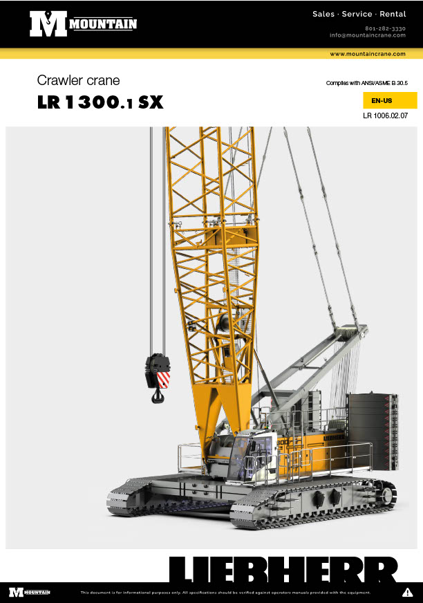 LIEBHERR LR 1300 SX CRANE OVERVIEW AND SPECIFICATIONS Official Manufacturer Model Name: Liebherr LR 1300 SX The Liebherr LR 1300 SX is a hydraulic lift crane. The innovative self-assembly and self-loading system enables unloading and assembly without an auxiliary crane. For crawler cranes in this size category, more cost-effective transportation and quick commissioning play an instrumental role in efficient operation. The LR 1300 SX has a max. lifting capacity of 300 metric tons (331 U.S. tons). The main boom can reach up to 92.04 m (302 ft). This crane is versatile allowing various combinations to reach different heights. The max. lifting height with boom and jib extensions is up to 169.16 m (555 ft). This crawler crane features a high-power Liebherr D 856 A7 SCR engine with a 238-gallon fuel tank, pushing 270 HP/2,000 rpm. This crane comes with a main winch, luffing jib winch and boom winch. The winches are compact in design and easy to assemble. The hydraulic system uses an axial displacement pump that supplies the open-loop hydraulic system for boom luffing, jib luffing and travel. The main hoist winches and swing are operated in a closed-loop system. All functions can be operated simultaneously.